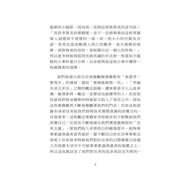 在本書中我所列舉的一些案例往往不是那些改變整個人類歷史進程的重大歷史事件,而是一些十分不起眼的小細節。因為我一直相信普魯塔克的這句話:「在許多著名的事蹟裡,並不一定能夠看出這些英雄偉人道德或不道德的一面,而一些小小的行動及言語,常常比造成數萬人死亡的戰爭、或大規模的佈陣、或對城池的攻防,更能顯示出一個人的性格。」所以更多時候我採用夾敘夾議的手法對一些看似不起眼的小事件進行分析,以求能夠從這些小事中獲得一些最樸素的道理。