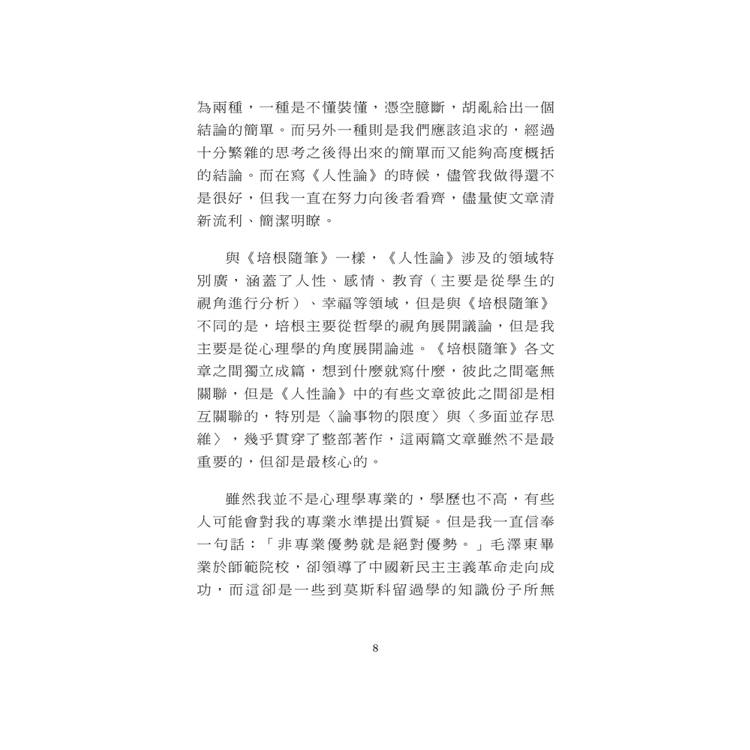 與《培根隨筆》一樣,《人性論》涉及的領域特別廣,涵蓋了人性、感情、教育(主要是從學生的視角進行分析)、幸福等領域,但是與《培根隨筆》不同的是,培根主要從哲學的視角展開議論,但是我主要是從心理學的角度展開論述。《培根隨筆》各文章之間獨立成篇,想到什麼就寫什麼,彼此之間毫無關聯,但是《人性論》中的有些文章彼此之間卻是相互關聯的,特別是〈論事物的限度〉與〈多面並存思維〉,幾乎貫穿了整部著作,這兩篇文章雖然不是最重要的,但卻是最核心的。