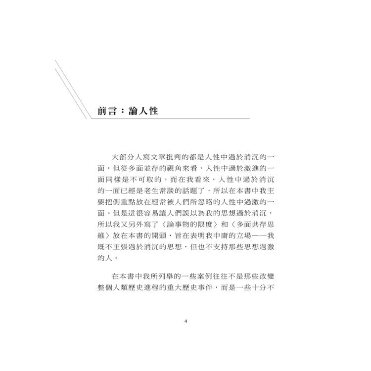 大部分人寫文章批判的都是人性中過於消沉的一面,但從多面並存的視角來看,人性中過於激進的一面同樣是不可取的。而在我看來,人性中過於消沉的一面已經是老生常談的話題了,所以在本書中我主要把側重點放在經常被人們所忽略的人性中過激的一面。但是這很容易讓人們誤以為我的思想過於消沉,所以我又另外寫了〈論事物的限度〉和〈多面共存思維〉放在本書的開頭,旨在表明我中庸的立場—─我既不主張過於消沉的思想,但也不支持那些思想過激的人。