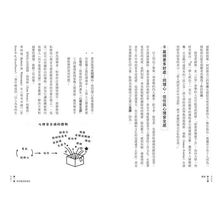 在這本書的第一部分中,我會先透過關於善良的科學來挑戰「商場上沒有善意可言」這個觀點。我們將探討管理理論、心理學、行為科學等不同領域的廣泛研究,了解善良如何帶來更高的成果、更好的合作和更多的優點。你將會看到,建立以善良為核心的團隊能有驚人的好處;你也會發現,最關心他人的領導者會創造一連串正面的結果,形成漣漪效應,像是提高生產力和員工留任率等等。