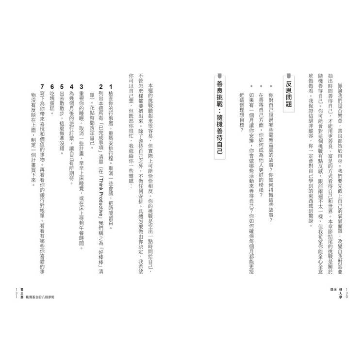 你將會發現,善良必須身體力行,不能只是嘴巴說說,所以這本書會給你滿滿的實用建議,每個章節的最後都附有問題供你反思。我鼓勵你利用這些問題來挑戰自己,並將書中的觀點和原則刻在腦海中。