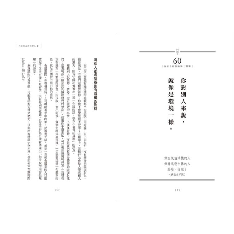 《以終為始的思考》讓我再次確認,真正成熟的好客精神,不在於貼近或炫技,而是在理解需求後,仍為對方保留空間與尊嚴。這是一部提醒我們放慢腳步、以百年眼界重新思考服務與生活本質的溫柔之書。