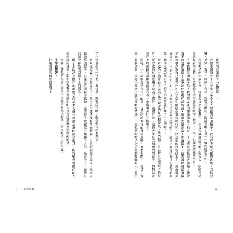 生命確實很美好。儘管我的頭髮掉光了、身體變得虛弱、眉毛也稀疏了,但我並沒有戴假髮,反而戴著那頂帽子,就像是我架起一塊廣告牌對癌症示威。人們很愛盯著禿頭的女人看,而當他們盯著我時就會看到這個訊息。