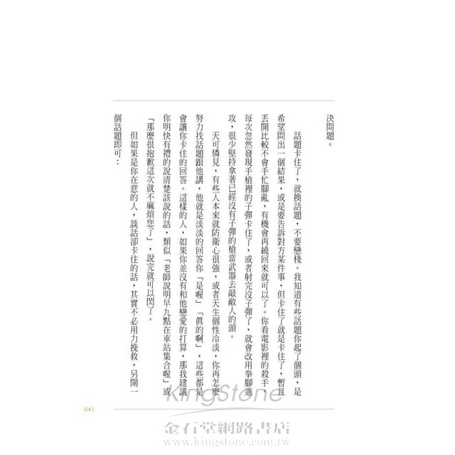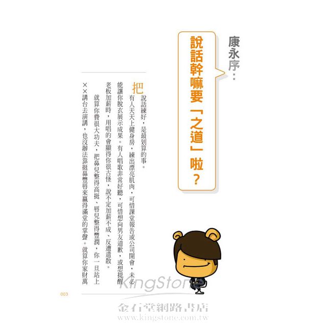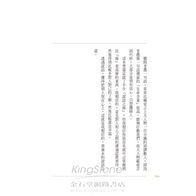 說出來的話好不好聽,有沒有辦法打動人心,真的是門學問。「我不在乎說話之術,而在意說話之道。我的說話之道,就是把你放在心上。」這樣的話聽起來揪甘心,這就是《蔡康永的說話之道》(如何),他的第一本實用書,40篇短文,都是讓談話變美味的醍醐味。