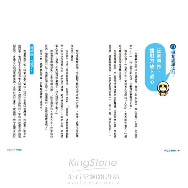 羨慕名人政要在言談間所流露出來的機智嗎?想成為人際交往的主角,職場與事業的勝利者?本書與你分享50招機智說話術:從表達篇、辦事篇、幽默篇、說服篇、反擊篇等等,以趣味故事、生動說明,加上人氣插畫家老吳的米滷蛋式爆笑插畫,讓你一讀就懂!