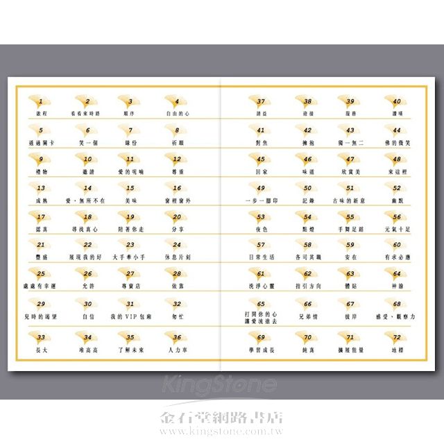 這是一套結合心靈敘事、旅行、攝影及文創商品設計的全新心靈圖卡作品,以京都這座美麗的城市為起點,透過創作者的文字與圖片,帶領讀者開展出生命裡頭關於愛的故事,學習七十二堂愛的功課。