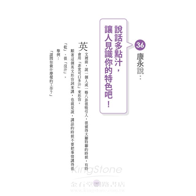 因為,第一本是思考的改造,第二本就是立刻上手的開始!在這些故事中,典型的說話障礙都被他點得清晰,每個故事都是「不會說話」的癥結!看完這本書,你才會知道自己因無知而固守的高姿態多麼沒必要,溝通絕不是等到撞了牆才知道要改,溝通前就學會庖丁解牛,不也是一種智慧嗎?