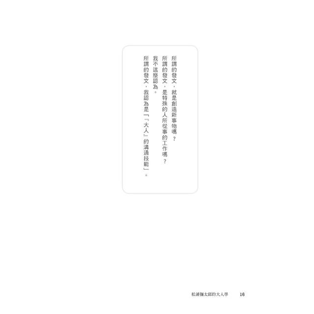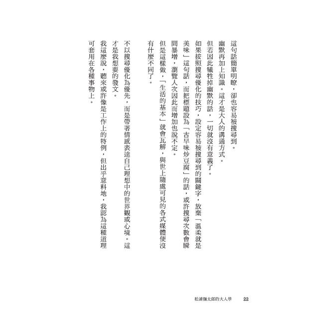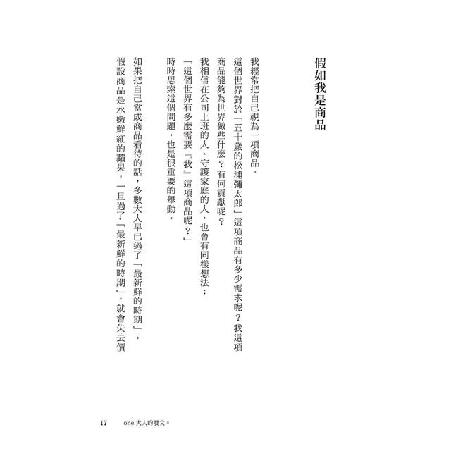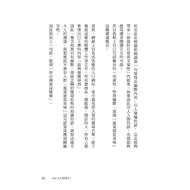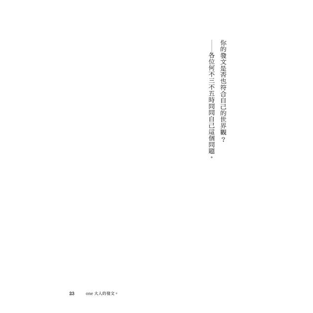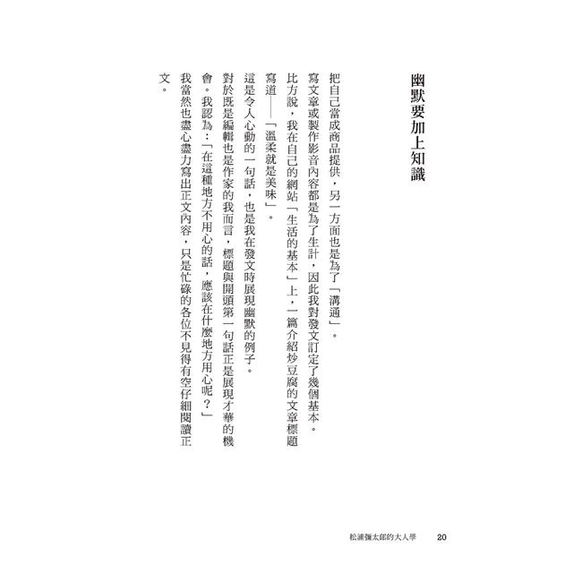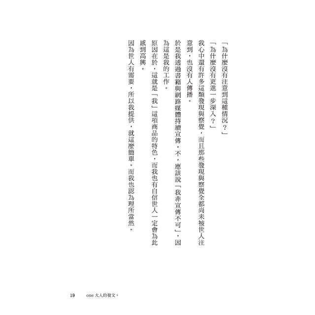 舉凡關於大人的:成果/交友/工作/寫作技巧/金錢觀/基本法則/時尚/興趣/計畫/創新等,都毫不保留地與人分享。