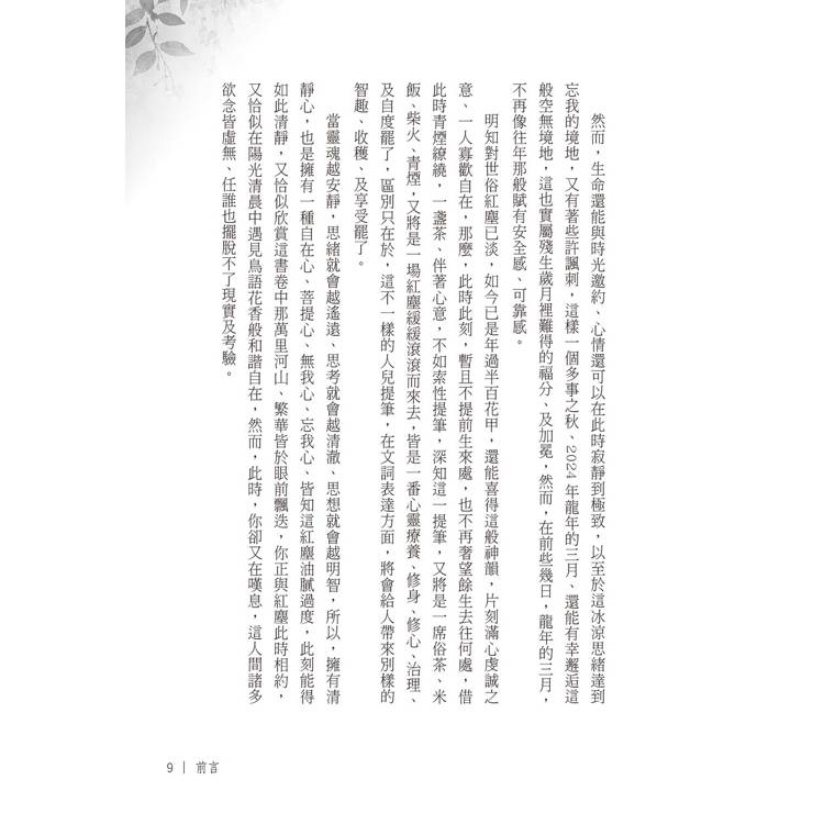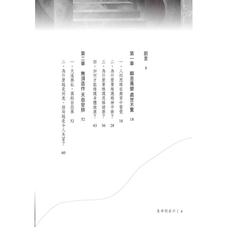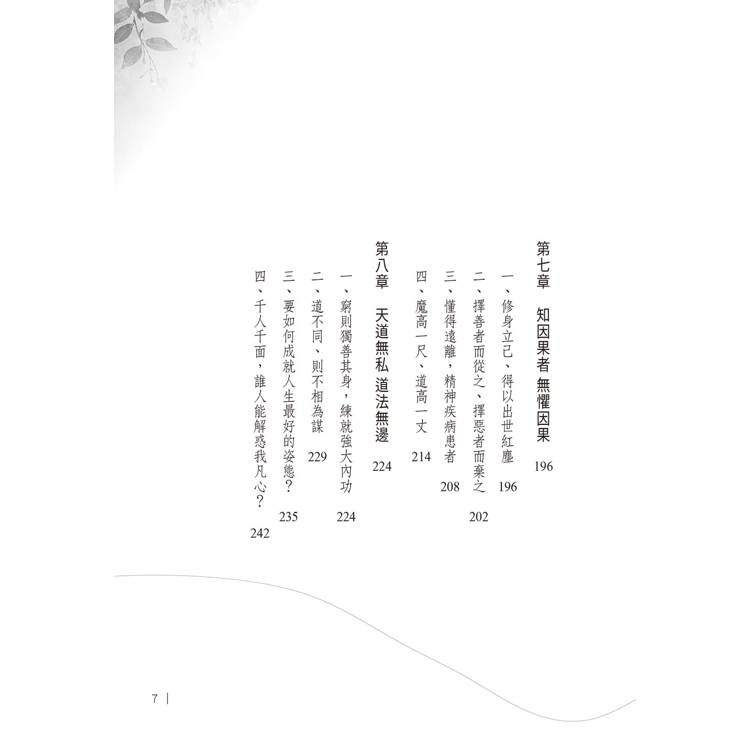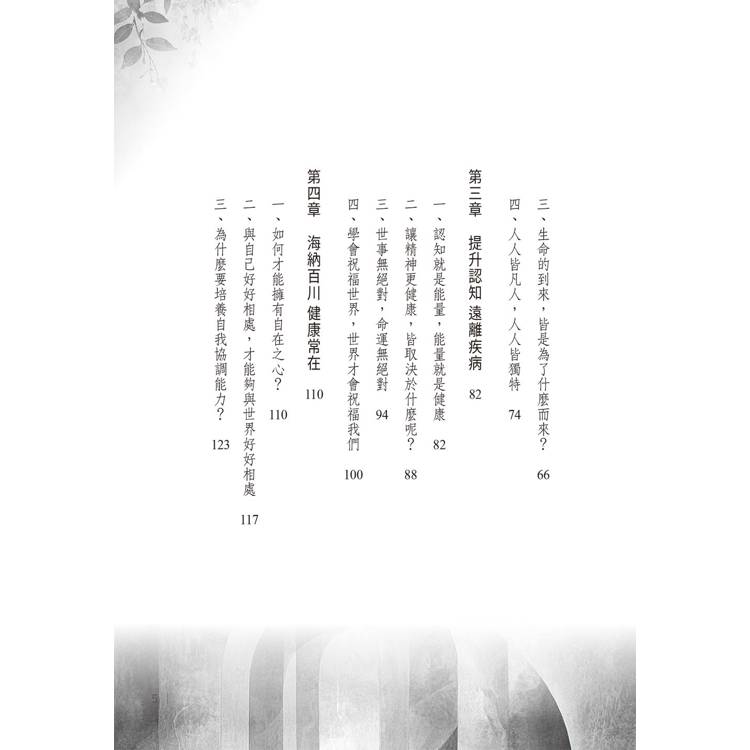 全書共分為八章,每一章都環繞著不同層次的生命體悟。例如第一章〈瞬息萬變 處世不驚〉,探討如何在無常的世界中保持內心的寧靜與覺察;第三章〈提升認知 遠離疾病〉,則進一步說明認知與健康的關聯性,提醒讀者精神狀態對身體健康的影響。第七章〈知因果者 無懼因果〉,則以因果論為基礎,鼓勵人們透過修身立己,超越紅塵的束縛。