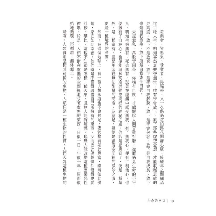 《生命的出口》是一部能夠啟發人心的作品,適合對生命哲學、心理健康與內在成長感興趣的讀者閱讀。它不僅是一本心靈療癒的指南,也是一部關於人生智慧的隨筆,提醒我們在紅塵紛擾中,如何保持清明與自在。