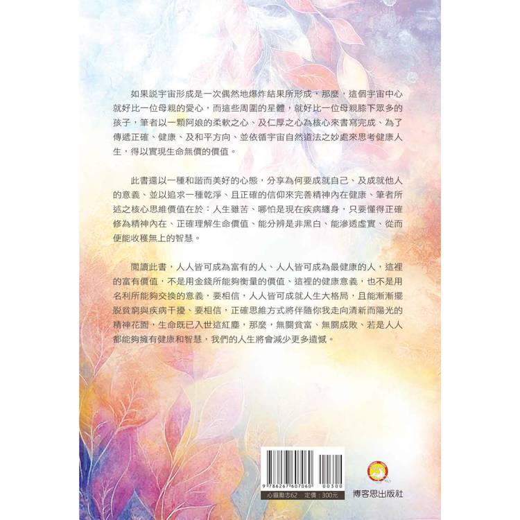 閱讀此書,人人皆可成為富有的人、人人皆可成為最健康的人,這裡的富有價值,不是用金錢所能夠衡量的價值、這裡的健康意義,也不是用名利所能夠交換的意義,要相信,人人皆可成就人生大格局,且能漸漸擺脫貧窮與疾病干擾、要相信,正確思維方式將伴隨你我走向清新而陽光的精神花園,生命既已入世這紅塵,那麼,無關貧富、無關成敗、若是人人都能夠擁有健康和智慧,我們的人生將會減少更多遺憾。