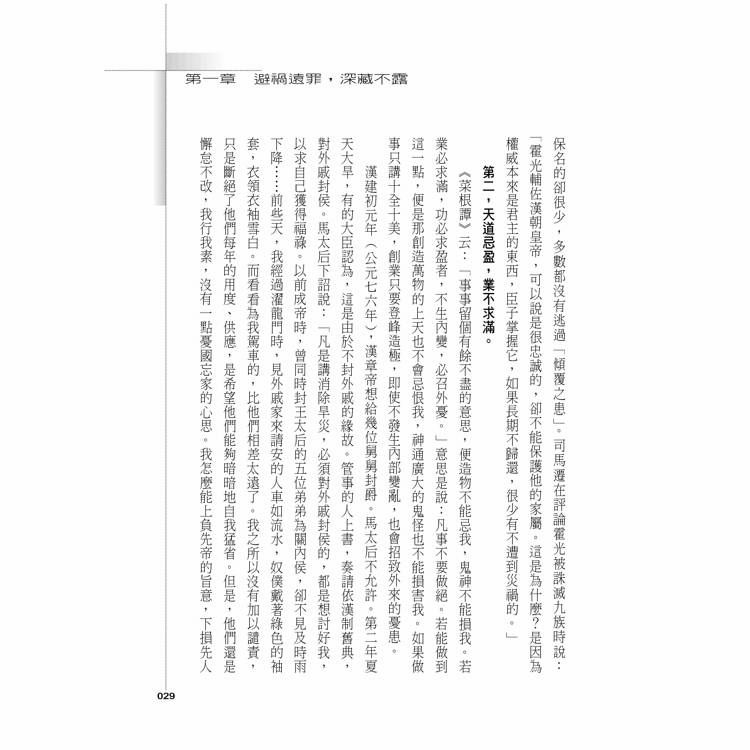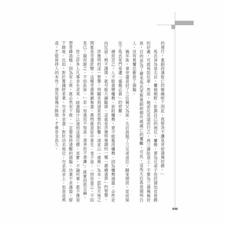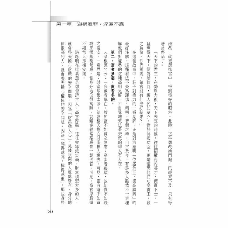 總而言之,人不能貪戀權勢,依附權勢,更不能濫用權勢。因為權勢過盛,必然走向反面;稍不謹慎,就可能大禍臨頭。這就是洪應明強調的一種「避禍遠罪」的智慧。洪應明的這一智慧,明顯受到道家思想的影響。道家以「虛無」為本,認為天地之間都是空虛狀態。這種空虛無窮無盡,萬物就是從中產生。老子說:「持而盈之,不如其己;揣而銳之,不如長保。」若「知進而不知退,善爭而不善讓」,就會招致災禍。世上許多人凡事求全求美,絞盡腦汁以達到這個目標。其實,不論何事,都不應妄想登峰造極。因為有上坡,就必然有下坡。一定要保持清醒的頭腦,功業不求滿盈,留下餘地。比如,對於置錢財家業,勿求多求盡;對於功名地位,勿求高求上。知急流勇退,才能保持人的本性;預先留幾分餘地,才會安全長久。