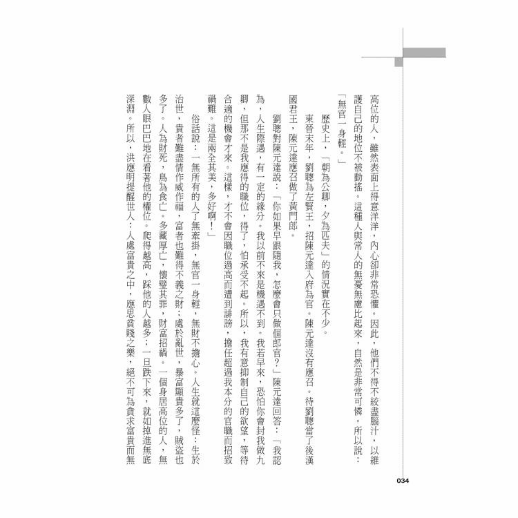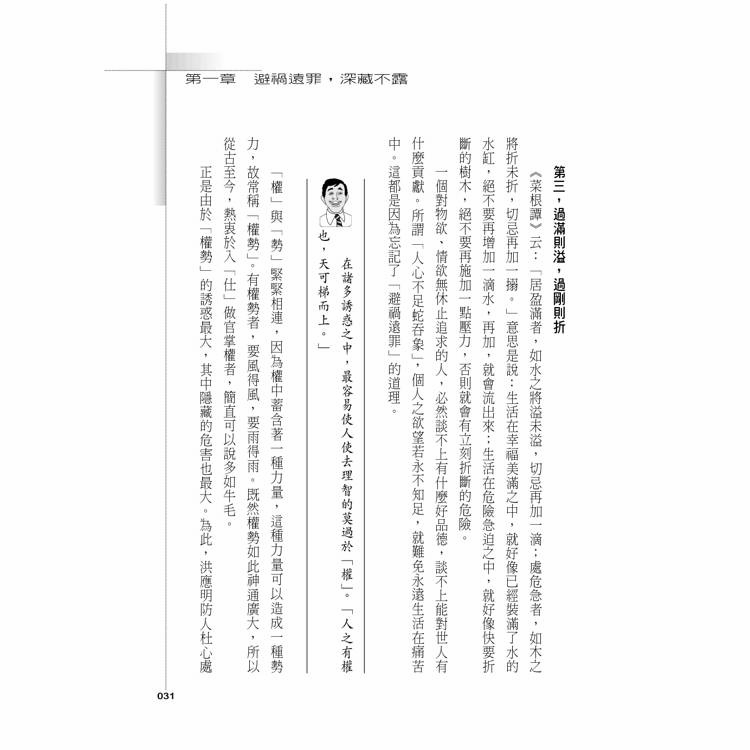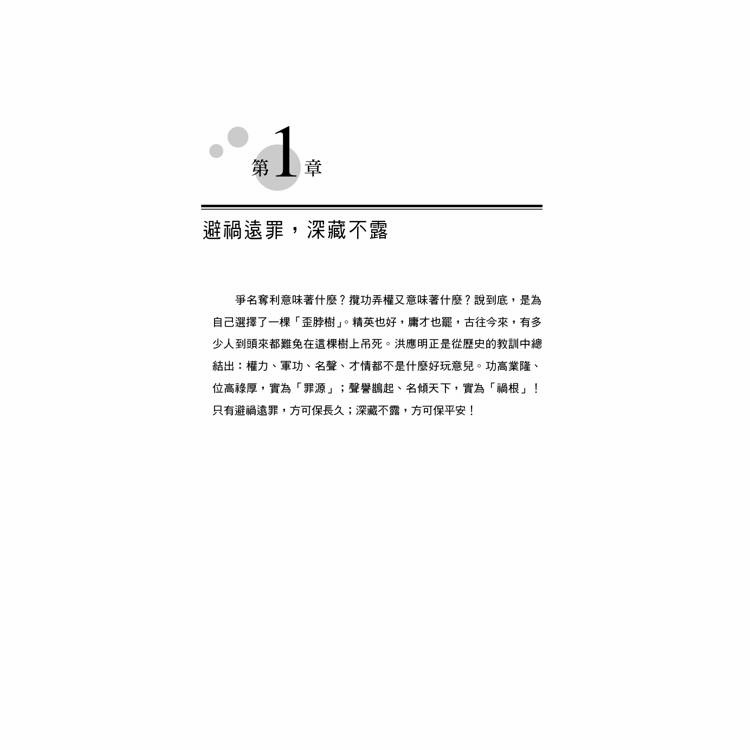 世間道理千千萬萬,但真理永遠相通。在這裏,富翁所領悟的「防人」之道恰好與洪應明的處世雞湯之要旨相吻合。有鑒於此,為了世人能夠最方便快捷地掌握洪應明處世雞湯,本書從洪應明「防人杜心」的處世角度,將他所拾集的「珍珠」重新穿輟,提煉出——「避禍遠罪,深藏不露;當忍則忍,吃虧是福;淡心寡欲,順其自然:厚德積福, 寧靜致遠」四大智慧,以饗讀者!