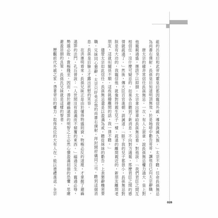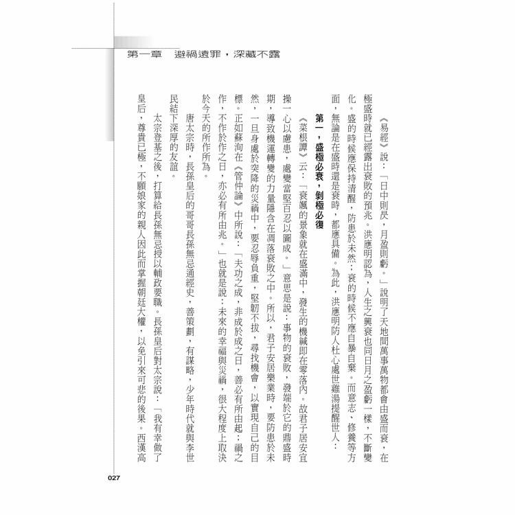 在洪應明看來,長孫兄妹正是由於懂得物盛則衰、物極必反的道理,才掌握了避禍遠罪的法門。孔丘曾說:「人世間沒有盈滿而不傾覆的東西。」福過災生,寵過必辱,勢盛必敗,貴極賤至。因而,善於避禍遠罪的明智之士必然心懷盈滿招損的恐懼,思慮避盈居損的良策。長孫氏兄妹就是這樣的智者。