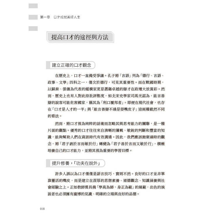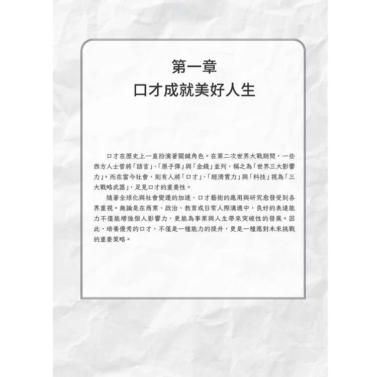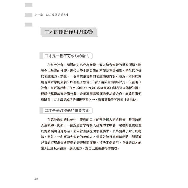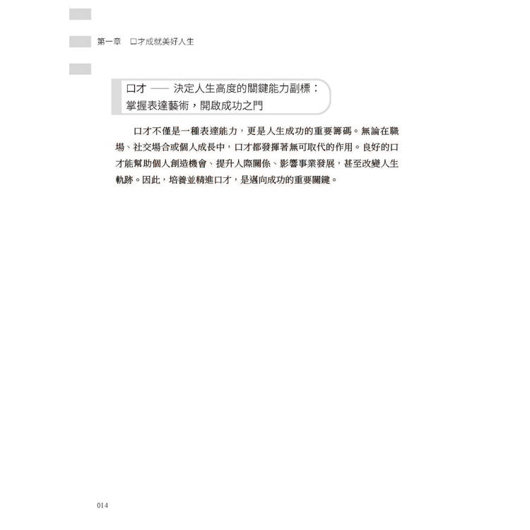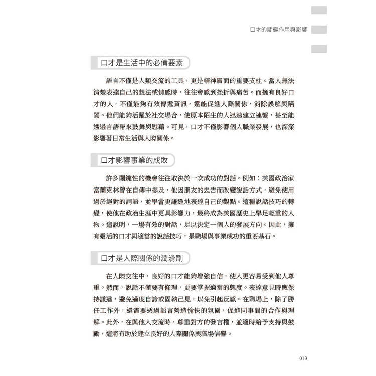 優秀的口才不僅能提升個人的職場生涯,還是建立並維護良好人際關係的關鍵。共情能力、非言語資訊以及適當的印象管理策略,都在這方面發揮重要作用。這本書提供了實用的方法來幫助讀者避免人際衝突,並在交流中建立信任感。無論是初次見面還是長期交往,都需要根據不同的對象和場合調整溝通方式,以實現最理想的交流效果。透過學習和實踐這些技巧,讀者將能夠輕鬆地在各種互動中站穩腳跟,不僅能有效地說服他人,還能在相處中成為受歡迎的對象。