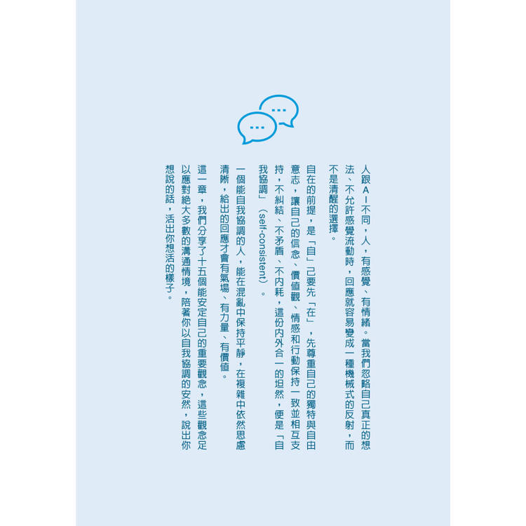 把人生主導權從「反射式的反應」,轉回「清醒的選擇如何回應」。在做出任何回應前,「心裡安定」整個人的狀態才會自我協調──不糾結、不內耗、不輕狂、不傲慢,也越能平衡自我與他人。