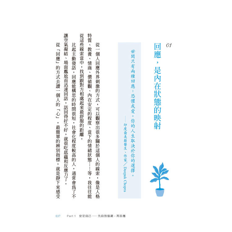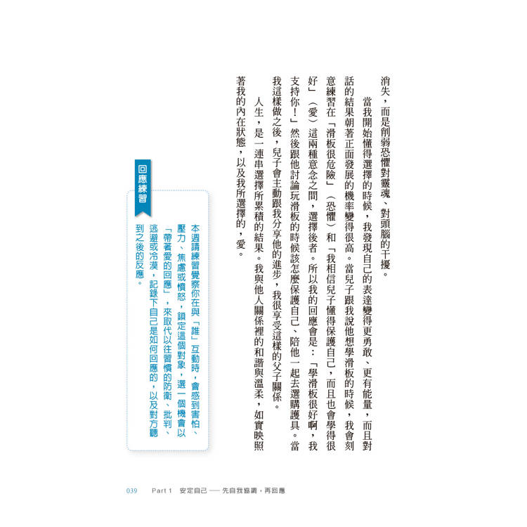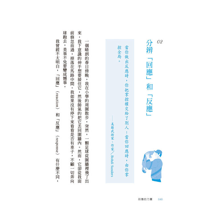 前後呼應,享受閱讀的儀式感:每篇文章開頭皆引用名言佳句,文後附上呼應主題的小練習,從行動中體驗回應的力量。