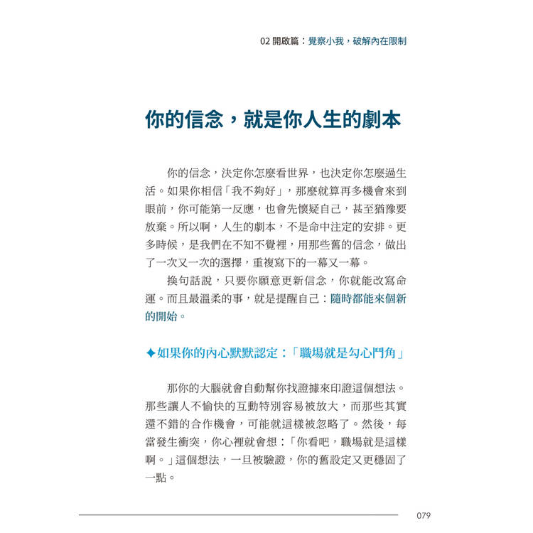 這就是為什麼,改變內在信念,往往比單純努力更重要。而這個改變,不需要你強迫自己立刻相信什麼新的觀念,也不是要你把自己全部打掉重練。你只需要做一件事,那就是先「允許」自己,看見「其他新的可能性」的選項。然後,透過一點點新的行動,讓身體去驗證這個新的可能。