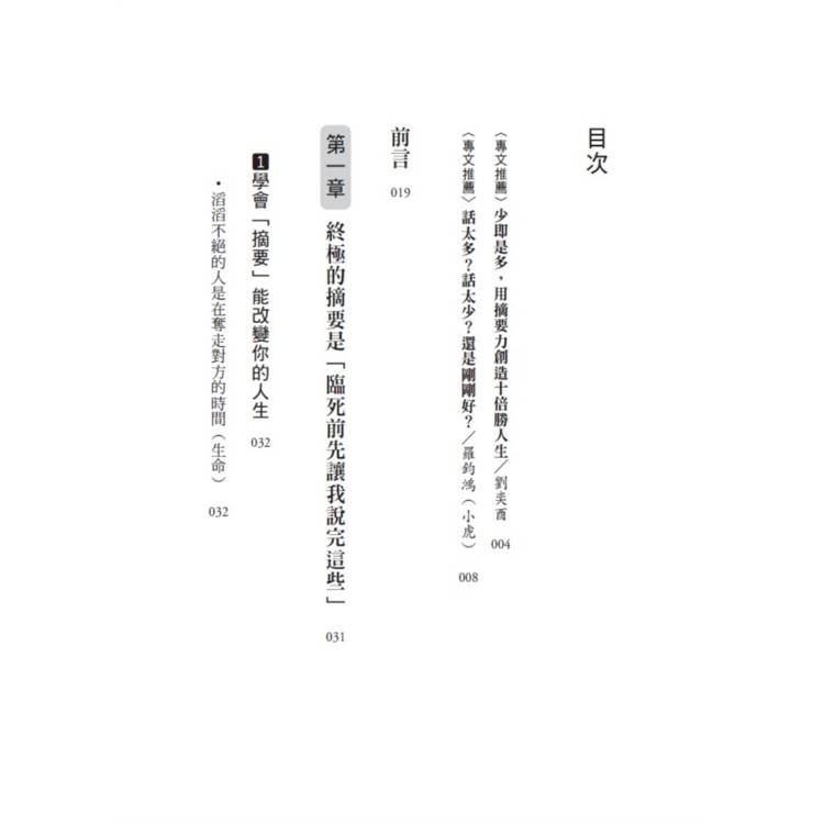 這本書有相當多的案例解析,告訴讀者如何逐步做好這些步驟、摘要重點,可以一邊練習,一邊參照書中的做法,提升自己的摘要力。我也因為摘要力,在工作與生活中獲益良多。不僅讓我更容易獲得關注與信任,也因此創造出專屬於自己的機會。──《高產出的本事》作者、職場生產力顧問 劉奕酉