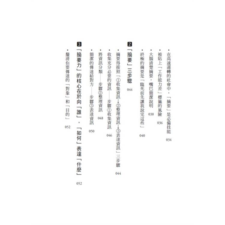 包含大量商業場域、日常生活必備摘要案例與練習題,幫助你從工作、社交到網路平台,擺脫講半天沒重點,給人「工作能力差」、「頭腦不清楚」的印象,說與寫都簡潔有力,從此成為「摘要達人」!