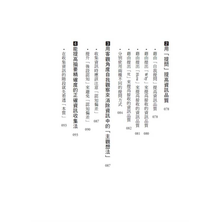 •     收集資訊:如何收集充分且必要的資訊,來提高摘要的精確度?可以透過「自我提問」來提高接收資訊的品質,藉由「後設認知」來避免資訊收集的認知偏差。