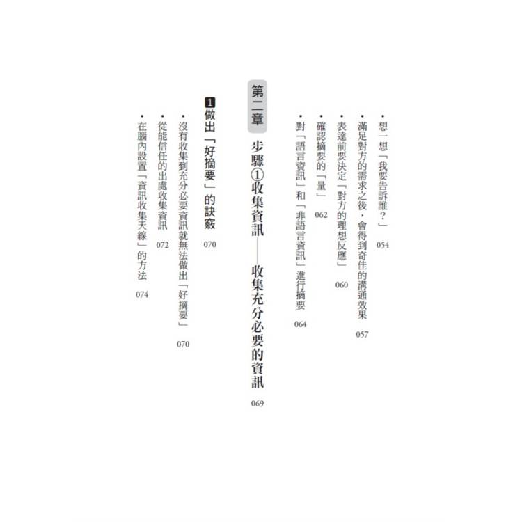 那麼,該如何提升摘要力呢?作者認為,只要依循著「收集、整理與表達資訊」三個步驟,每一個人都能做好「摘要」這件事。但是要做到什麼樣的程度才算是好呢?簡單來說,就是能將資訊妥善地傳達給對方,最終達成自己期望的目的。