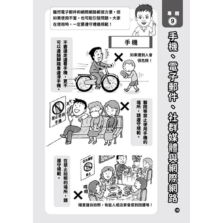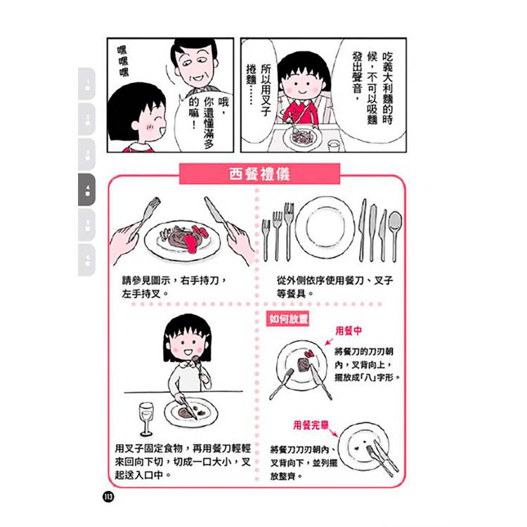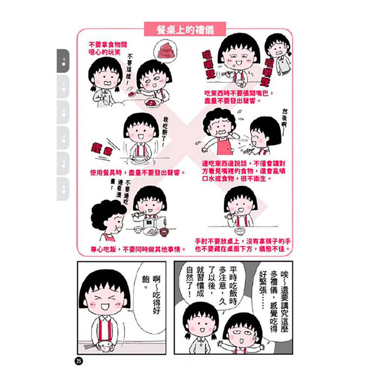 社交負面教材:透過小丸子在餐廳點餐時用手指指點點 、接電話忘了問對方姓名 、或是網路留言引起誤會 等「失禮情境」,讓讀者在笑聲中產生「啊!我也犯過這種錯」的共鳴。