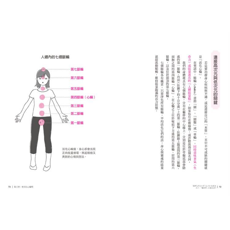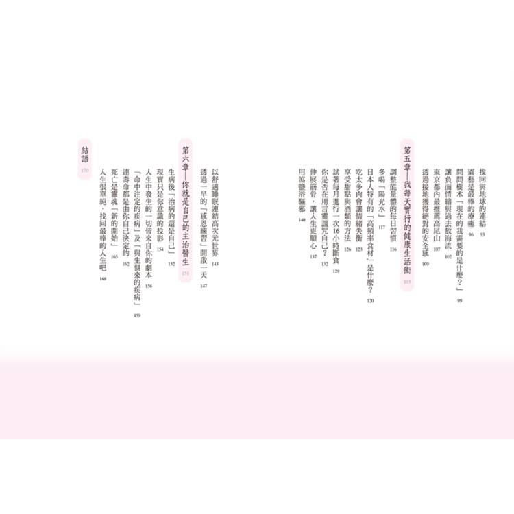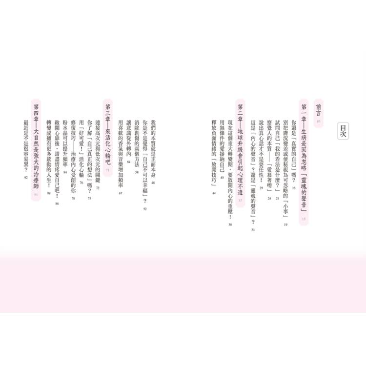 第三章將介紹以愛充滿自身、提升能量頻率的核心──心輪的活化。第四章會解釋幫助我們強化與地球間的連結,增加能量的方法。第五章介紹的是我本身也在實行的生活技巧,可以幫助我們調整身心能量的平衡。