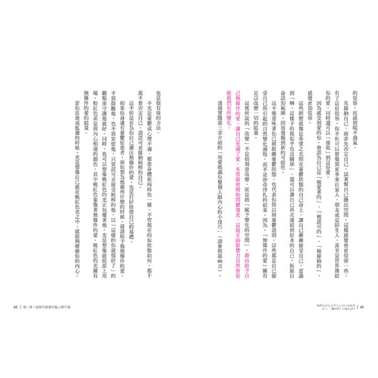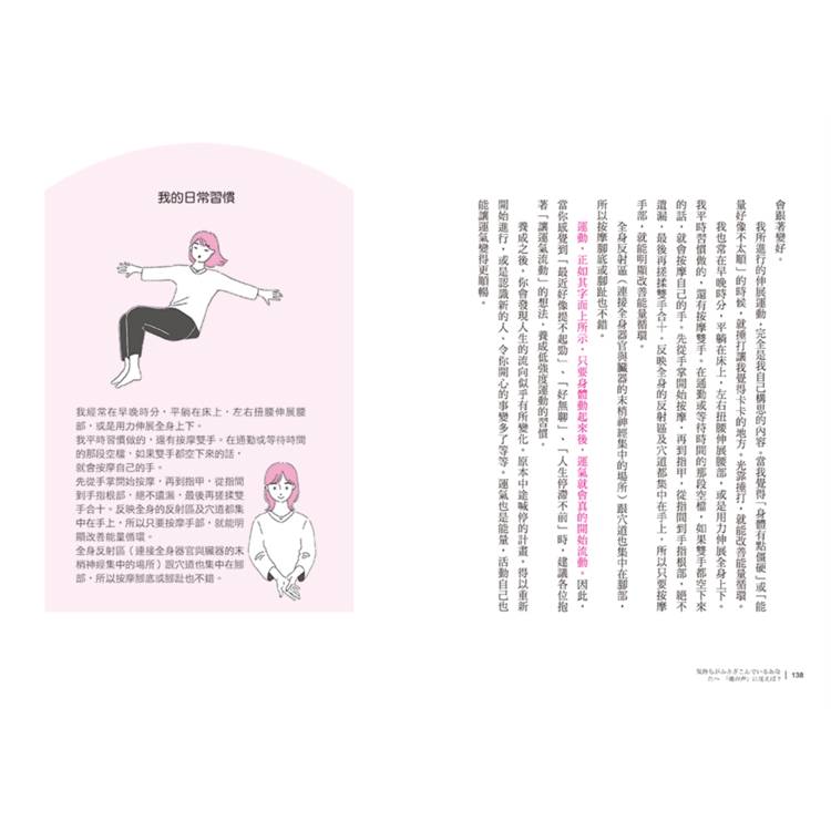 我一直覺得身與心是密不可分的。與「真實的自己」背道而馳時,容易產生強烈的內耗感,累積一段時間後身體會感到失調,時間久了也許累積成疾病。與「真實的自己」並肩同行時,能感覺到自在、愉悅、輕鬆,並且自帶一種由內而外的輕盈感。這本書引領我們從覺察現在的自己,然後慢慢地接納、釋放和連結,最後與真實的自己一同前行。一起開始這趟療癒之旅吧!──茱蒂(Instagram 療癒系創作者)