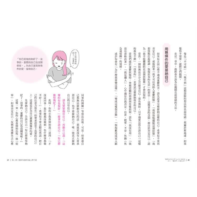 第一章會解說找出自己的本質、靈魂聲音的方法。第二章則主要說明該如何才能擺脫讓自己本質罩上陰影的負面情緒。