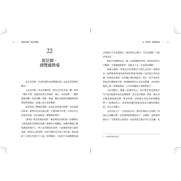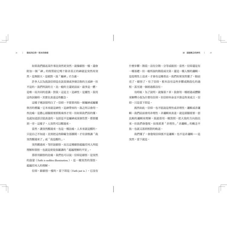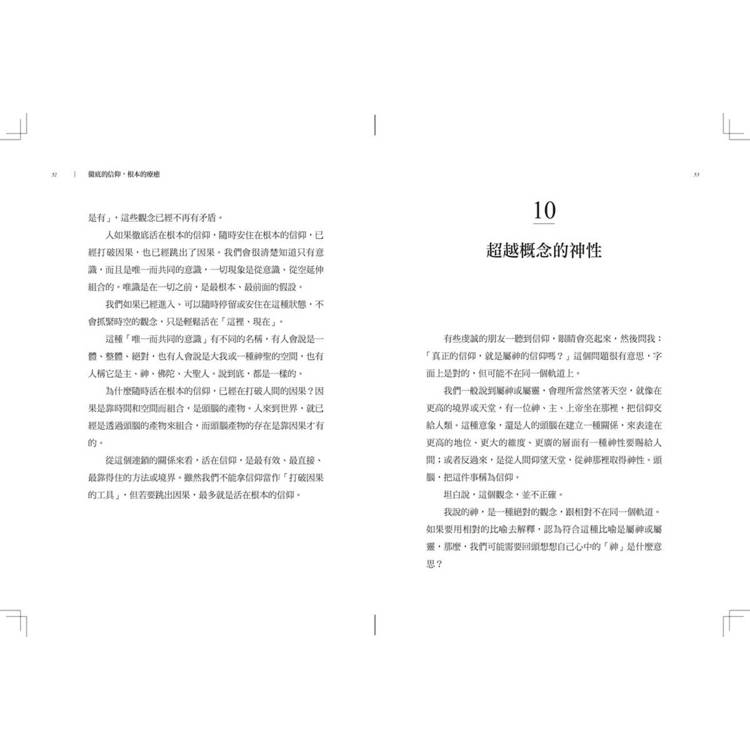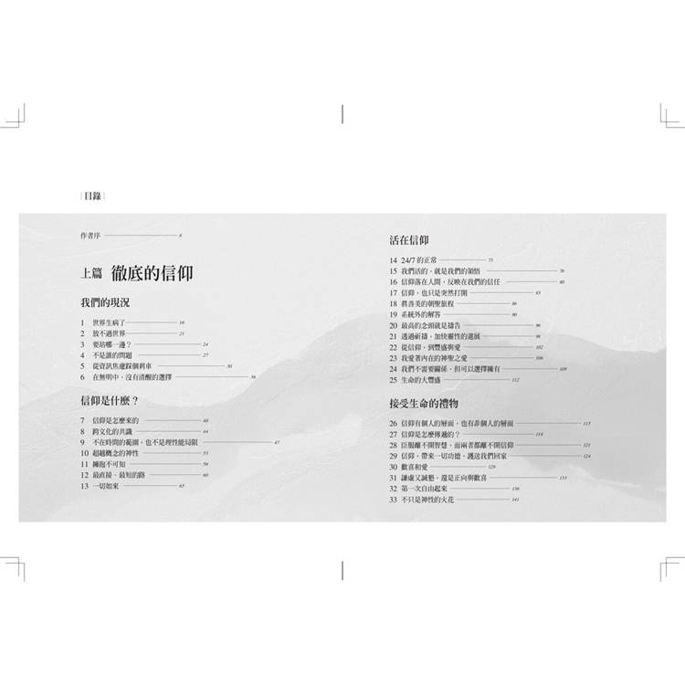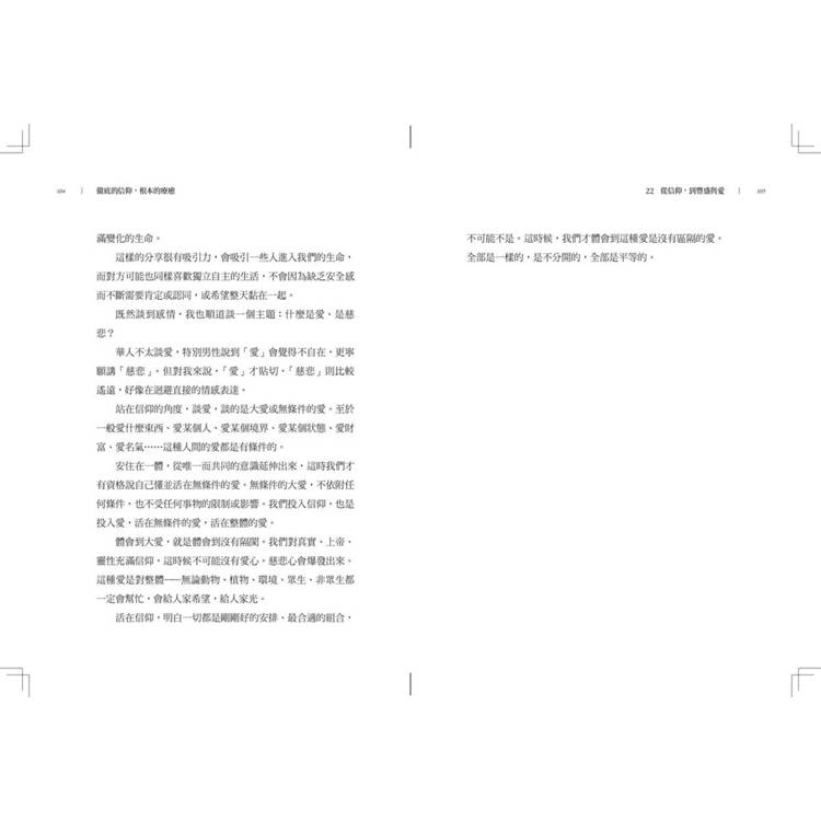 所以我用最誠懇的心進入信仰這個主題,分享別人眼中可能是成就的一些靈感和體驗。但願這本書能作為一面鏡子,和我們的觀念與領悟兩相對照,體會與信仰的相關性。