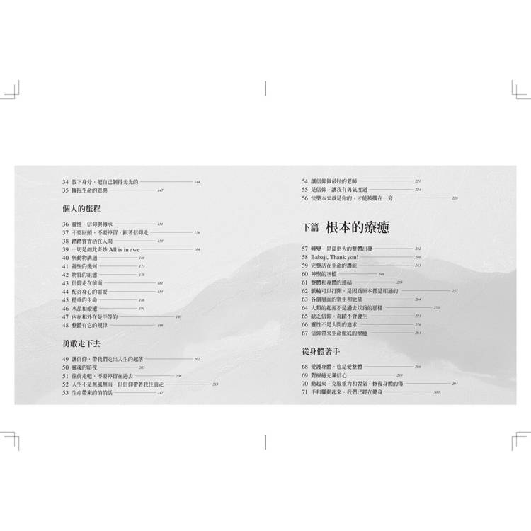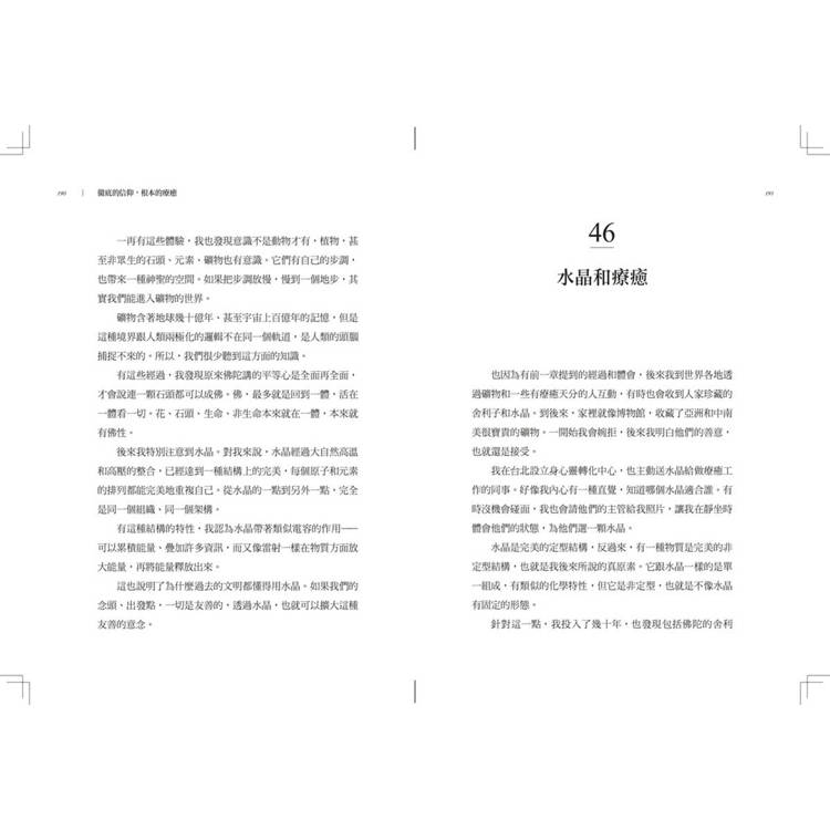 寫這本書,其實是我對這些古往今來的大聖人所獻上的一份供養,表達我個人最高的尊敬。我真正想傳達的療癒,是身心靈在一瞬間的轉變與契合,和頭腦的邏輯無關。與整體合一,整體自然會療癒我們,而且是理所當然,根本算不上是什麼誇張的突破,或是不可能發生的奇蹟。