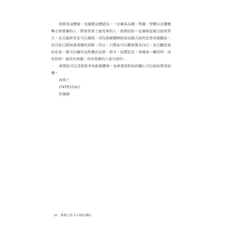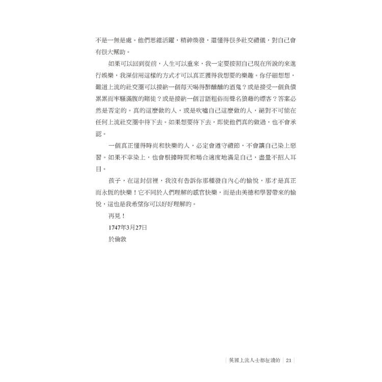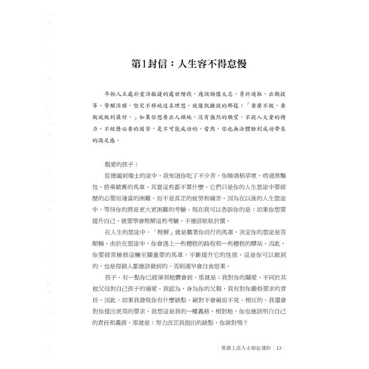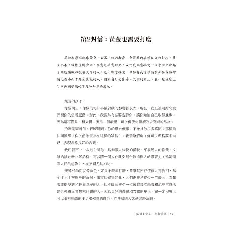 本書談到的學習、禮儀、處世、成功等話題,都是現在年輕人關注的話題,也是家長們教育孩子的關鍵。在當時那個年代,本書曾經以手抄本形式在歐洲貴族階層中廣為流傳,被視為「一部可以使孩子步入高貴和脫胎換骨的神奇家書」。如今,伯爵的時代已經離我們遠去,但是書中所表現的人生智慧,卻仍然對人們大有裨益。