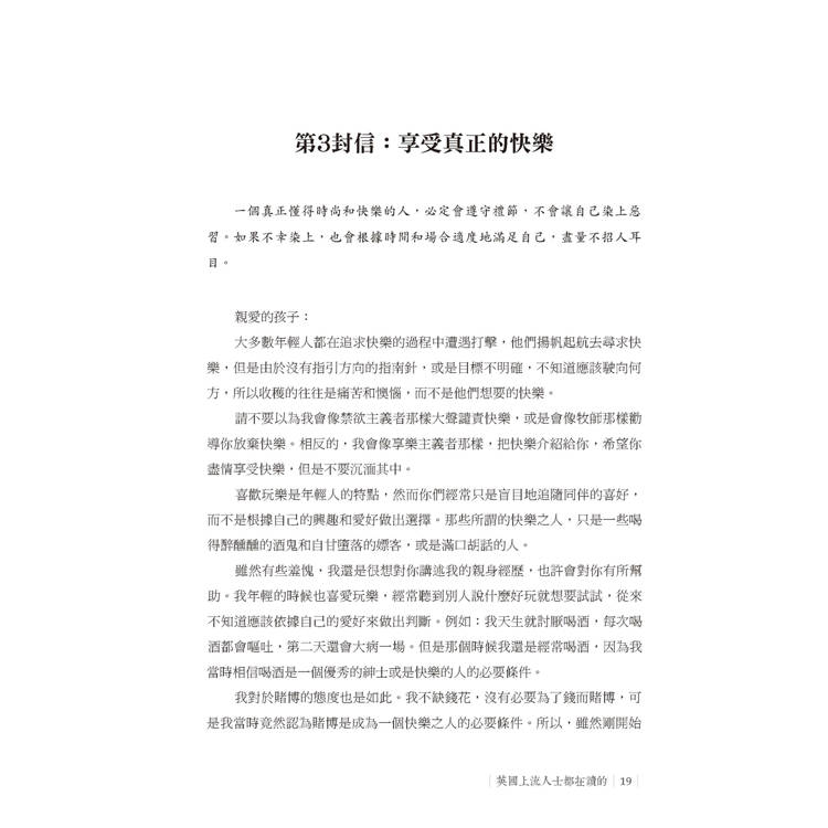 本書凝結的都是年輕人步入社會和走向成功必須學會的人生哲理,正如伯爵在信中對兒子說:「這是你初涉世道和踏入社會必須掌握的一些秘密。我希望自己在你這個年紀的時候,就懂得這些道理和準則。我付出三倍的代價,花費五十年的時間,才得到這些人生的真諦。在此,我毫不吝惜地將它傳授給你,希望你從中獲得啟示和教益。」