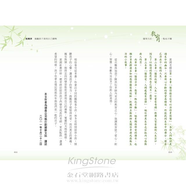 期待本書,能讓大家閱讀愉快,更期待能從其中,找到您要的「教育理念」與思考出對待孩子的方式。湘祝福翻開本書的有緣人,都是下一個教育良師。