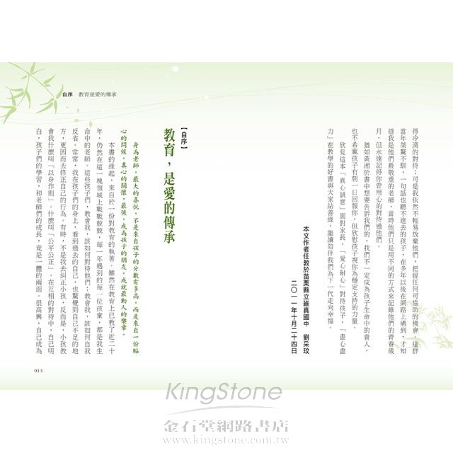 本書的緣起,來自於一份對教育的執著。雖然在教育上已教了近二十年,仍然在這一塊領域上戰戰兢兢,每一年遇到的每一位孩童,都是我生命中的老師。這些孩子們,教會我,該如何對待他們;教會我,該如何自我反省。常常,我在孩子們的身上,看到過去的自己,也驚覺到自己不足的地方,更因而去修正自己的行為。有時,不是我去糾正小孩,反而是,小孩教會我什麼叫「以身作則」。什麼叫「公平公正」。在互相的對待中,自己明白,孩子們的學習,和老師們的成長,竟是一體的兩面。很高興,自己成為老師。因為這樣的行業,讓自己習得了「耐心」、「公平」、「公正」,更因此習得了「忍耐」與「等待」。