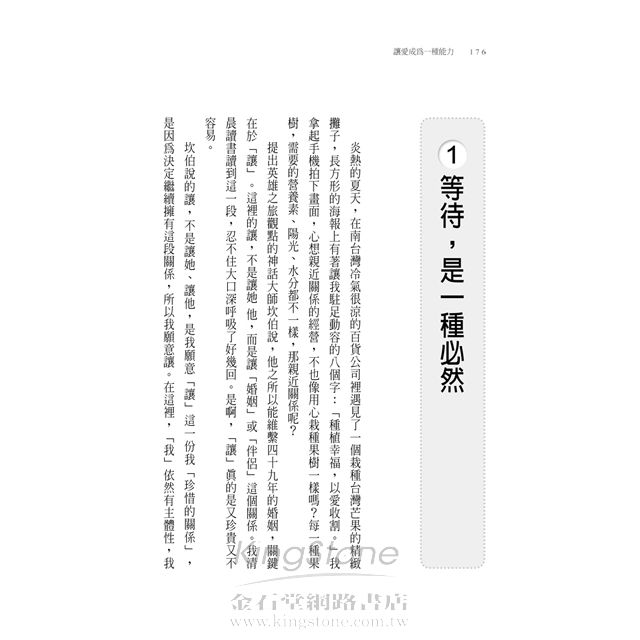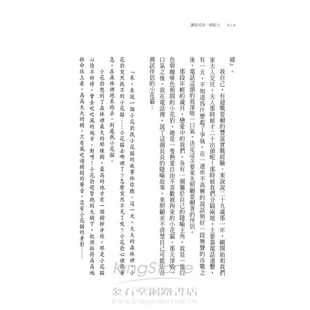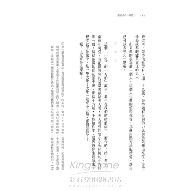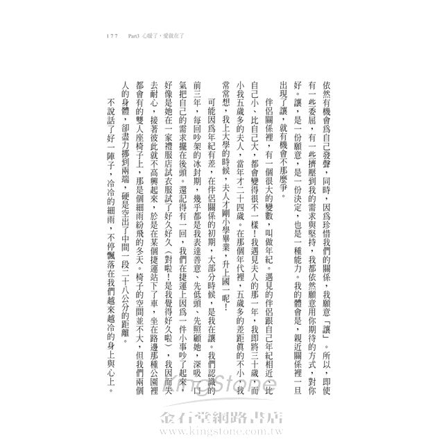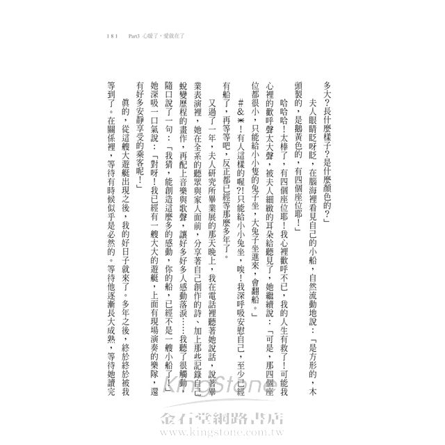 而他的文筆細膩,除了心理諮商師很擅長用的故事隱喻之外,還把他始終無法忘情的文青感懷,化作文藝腔十足、近似偶像劇對話的感性告白,讓讀者在閱讀本書時處處驚豔。諸如:「很想很想確定,會有一個人,即使我們無理取鬧,他都會把我擁入懷裡,完整地疼愛。」「我把你當空姐;你把我當空氣。」「於是,憂傷,有了藍色的深潭相伴;於是,孤單,有了稻穗般的大地當背景;於是,快樂,有了寬寬廣廣的天空可以飛舞。」