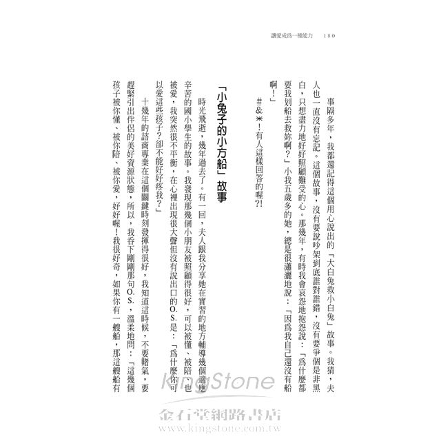 百忙中細細捧讀哈克老師最新作品《讓愛成為一種能力》,很佩服他的誠懇與用心,為了幫助讀者找回愛的能力,把他家中大小事都搬出來,舉凡一家四口的甜蜜或衝突,還有他和爸爸、爺爺之間互動的感謝與遺憾,都毫不吝嗇地以生動感人的文字,建構出具體的畫面,呈現在讀者眼前。