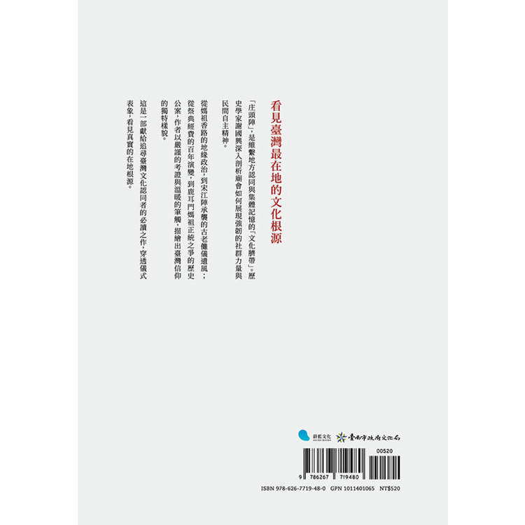 從媽祖香路的地緣政治,到宋江陣承襲的古老儺儀遺風;從祭典經費的百年演變,到鹿耳門媽祖正統之爭的歷史公案,作者謝國興以嚴謹的考證與溫暖的筆觸,描繪臺灣信仰的獨特樣貌。