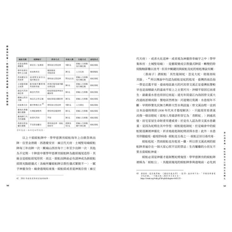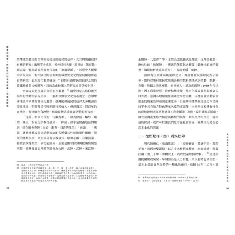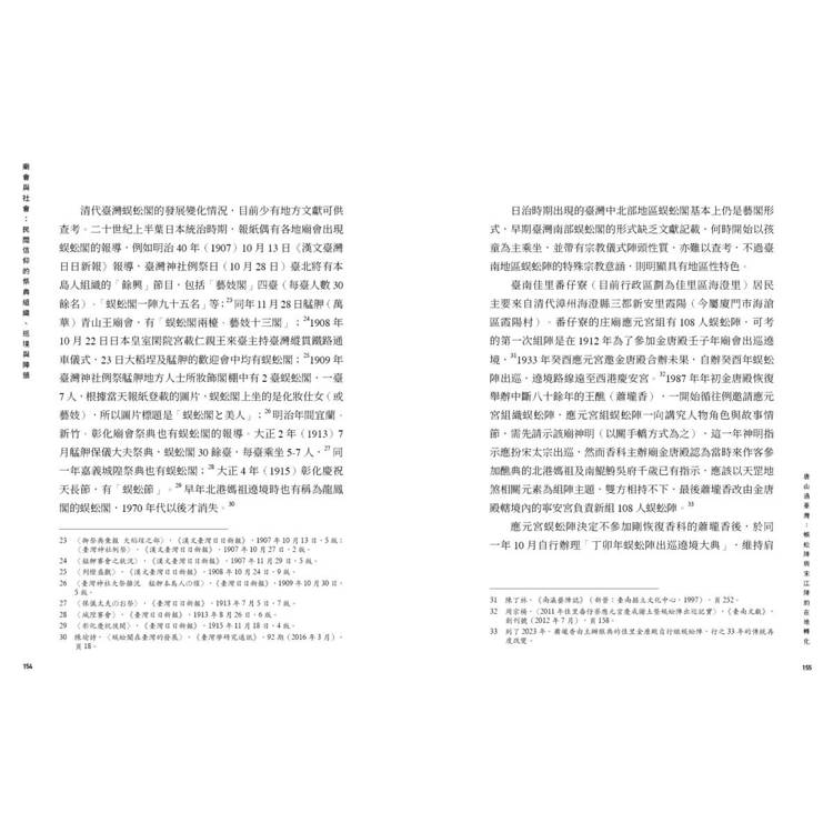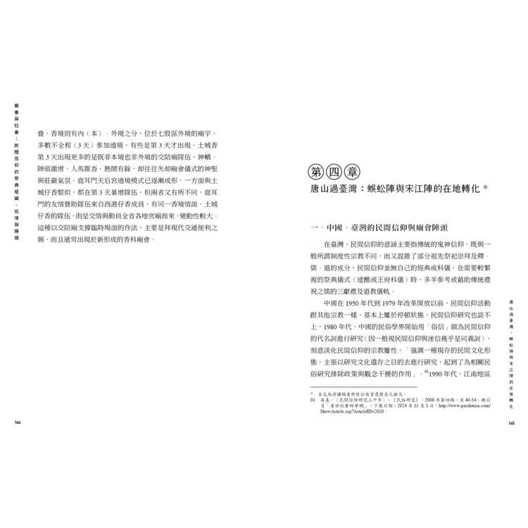 這部作品收錄了作者二十年來研究的精華,精選七篇未曾集結出版的關鍵論文,並加以大幅增修,部分篇章甚至是近乎一半的改寫。全書透過歷史學的嚴謹考證,輔以地理資訊與數位工具的現代方法,結合親身走訪廟會現場的細膩觀察,為讀者揭開臺灣廟會活動背後複雜而迷人的歷史文化意涵。