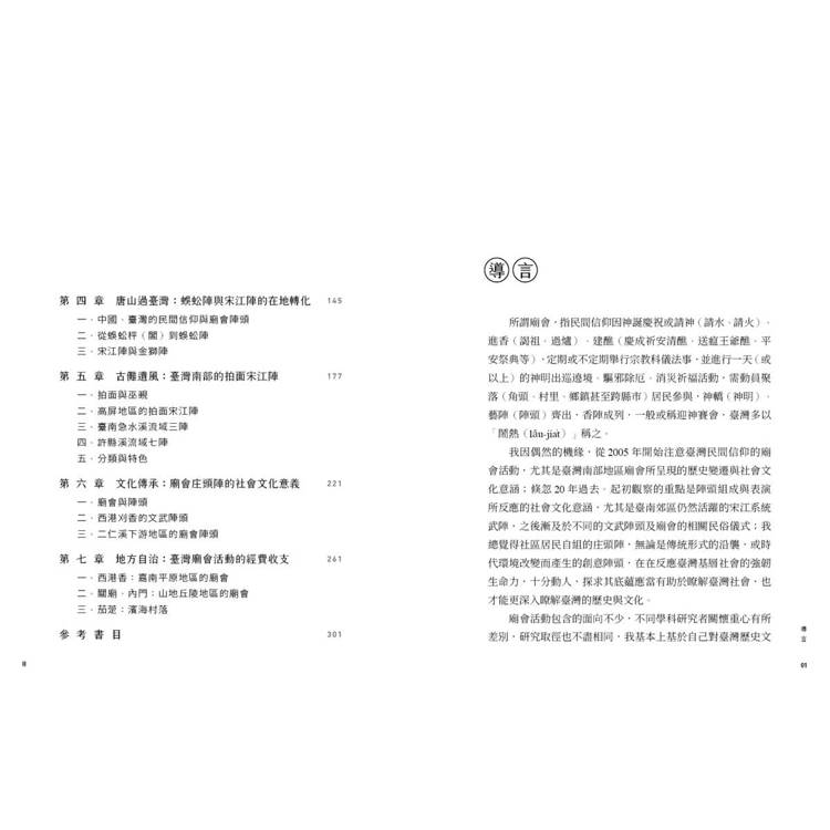 黃校長文博兄主編臺南文化叢書,建議我把過去單獨發表的一些論文稍作集結,成一冊專書出版,便於有興趣的讀者免去查找麻煩。我因此從過去發表的單篇論文中,選擇與醮典、廟會、繞境、友境交陪議題比較具有關連性的文章六篇,加上一篇討論臺南土城聖母廟與鹿耳門天后宮正統爭議的文章,合共七篇,構成本書各章節。這七篇中除了〈文化傳承:廟會庄頭陣的社會文化意義》一篇曾收入前述《臺灣史論叢:進香.醮.祭與社會文化變遷》論文集之外,其餘六篇內容基本上未重複出現在上述各冊專書內,〈唐山過臺灣:蜈蚣陣與宋江陣的在地轉化〉一文係將過去的演講稿改寫而成,算是新作,其他各篇原是歷年發表舊作,此次為收入本書,多數均經修改調整,有幾篇幾乎改寫一半以上;重新收入本書的〈文化傳承:廟會庄頭陣的社會文化意義》一文,也再度增補修訂了一些內容。