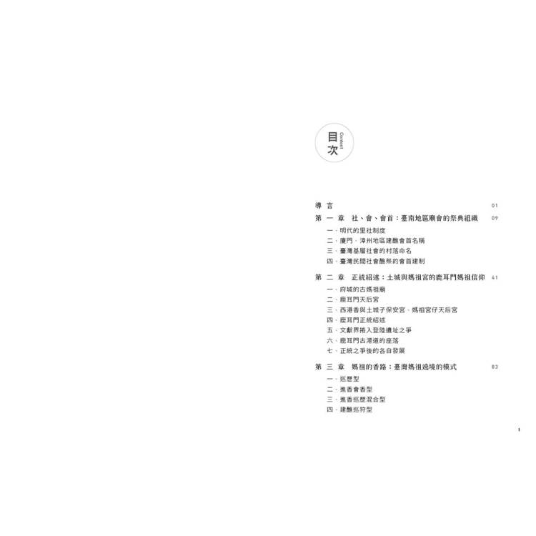 本書第一章〈社、會、會首:臺南地區廟會的祭典組織〉主要討論臺南地區為了建醮而成立的祭典組織,其名目(會首)的起源與變化,論其淵源,至少可追溯到明代初期官方制定的里社祭祀制度,此一制度影響了後來閩南地區的傳統村落命名方式,但到了臺灣,因應本地已有番社聚落存在,因此臺灣基本上並未繼承大陸原鄉以「社」為主的村落命名習慣,代之以「庄」為名,但祭祀組織則沿襲原鄉舊慣或加以轉化;文章中也列舉近年漳州、廈門地區建醮祭典組織與會首名稱的變化狀況,以資對照。此一議題過去似未見有人研究討論,收錄於此,期能拋磚引玉。