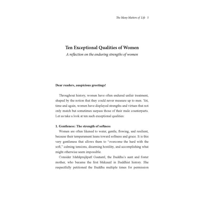 The Many Matters of Life is a collection of heartfelt reflections on how to live with wisdom, kindness, and purpose. Drawn from the teachings of Venerable Master Hsing Yun, each short article explores the choices we make, the relationships we build, and the values that shape our lives.