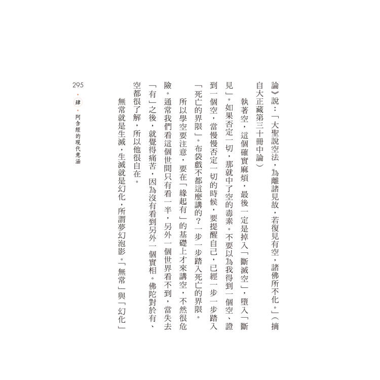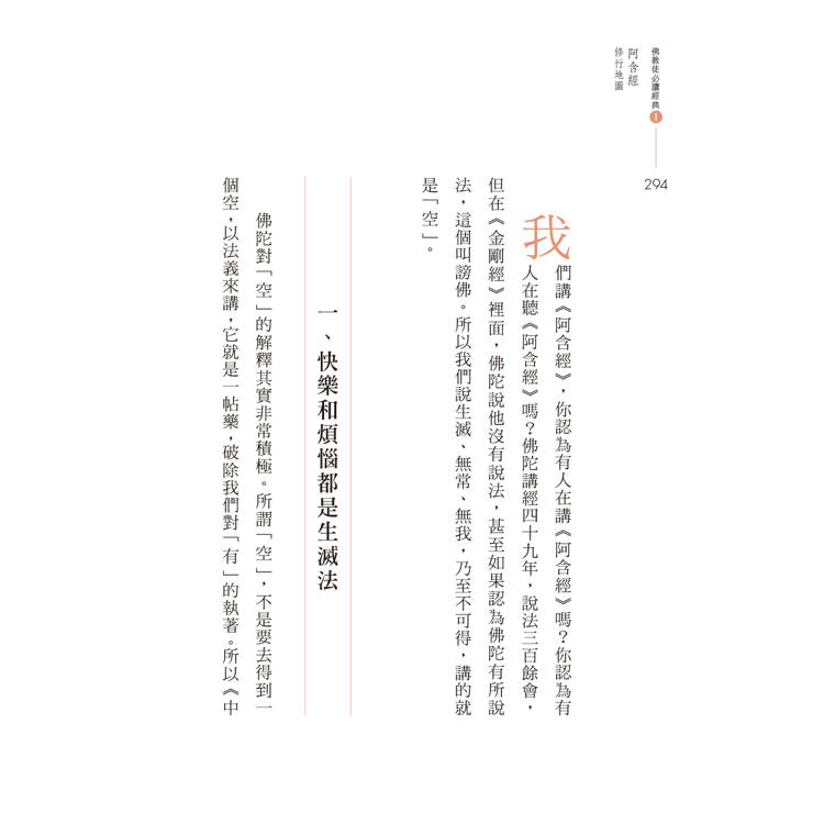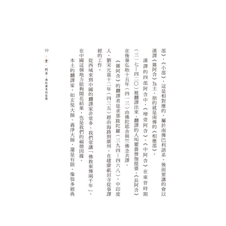 漢傳的《阿含經》分為四類,一般稱四阿含:《長阿含》、《中阿含》、《增壹阿含》與《雜阿含》,如果加上《雜藏》,就是五阿含。在四阿含中,《雜阿含》為最大的一部,也是四阿含中最早成立者。本書即以漢譯《雜阿含》為主軸,將「五蘊」、「六入處」、「十八界」、「緣起」、「四聖諦」,「無常」、「苦」、「空」、「無我」,雜揉以作者深入淺出的解說及譬喻,簡明的文句,呈現佛陀重要教理。尤其第四部分「阿含經的現代意涵」,引導讀者在《雜阿含經》的基礎上,正觀生滅、緣起,知苦滅苦、知緣悟空,從而轉念參究法樂。