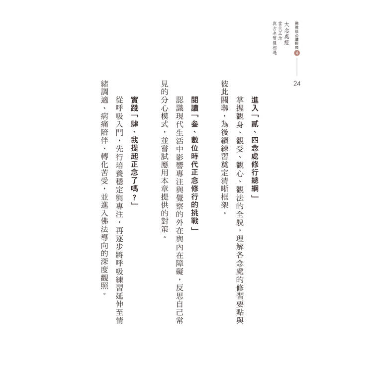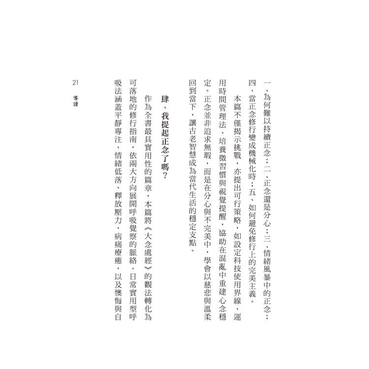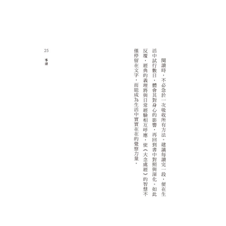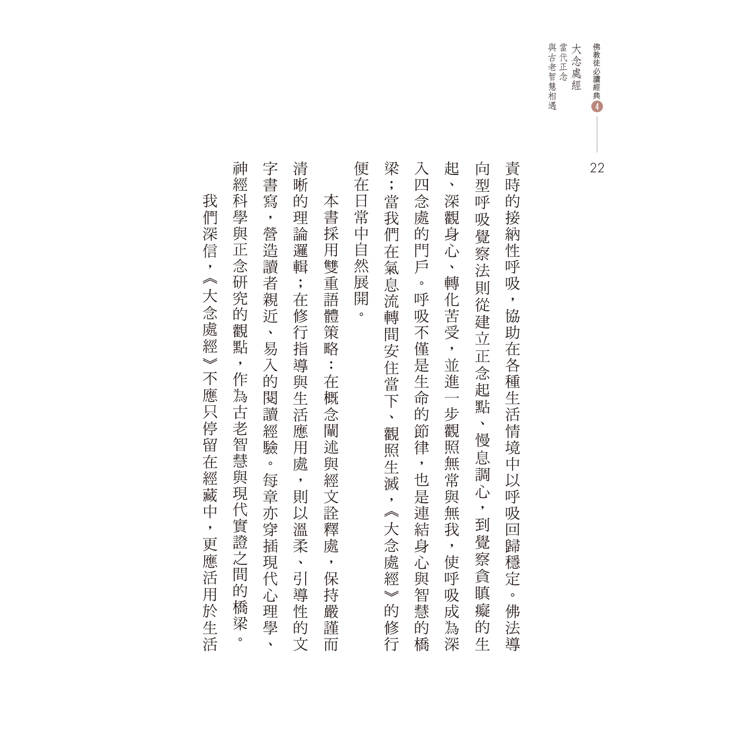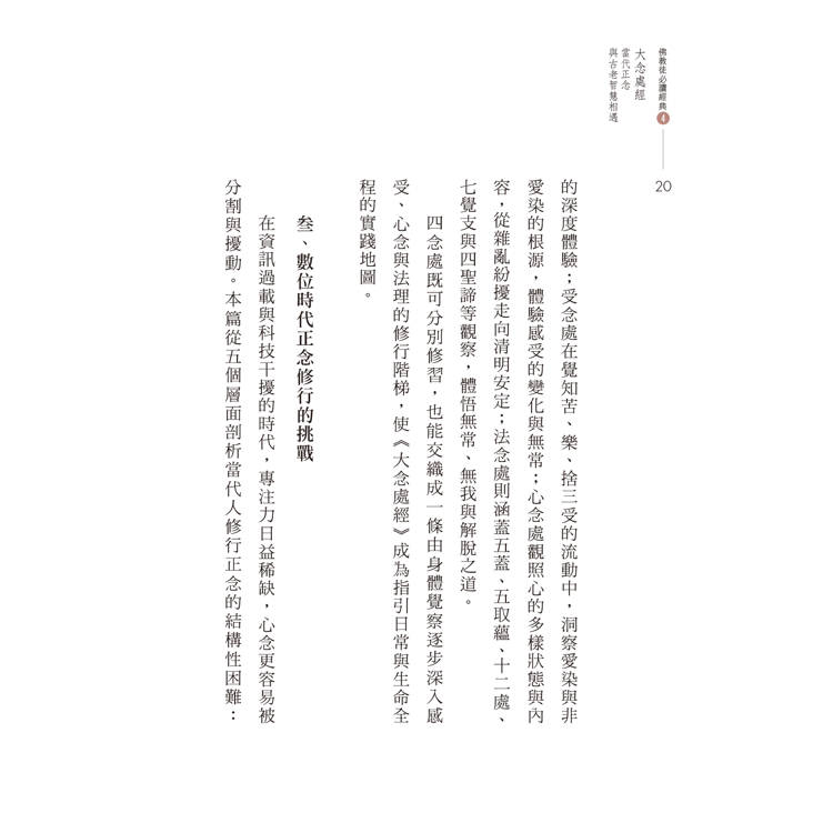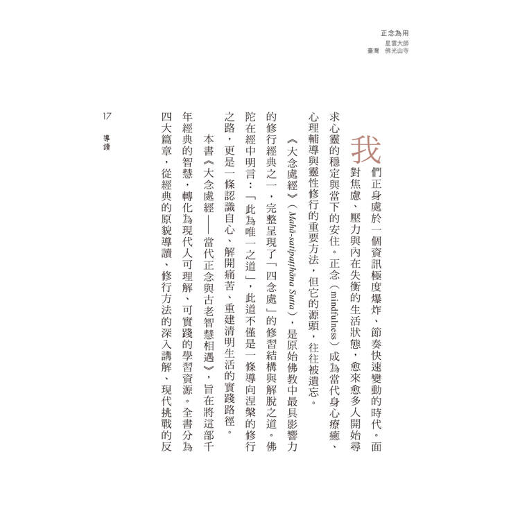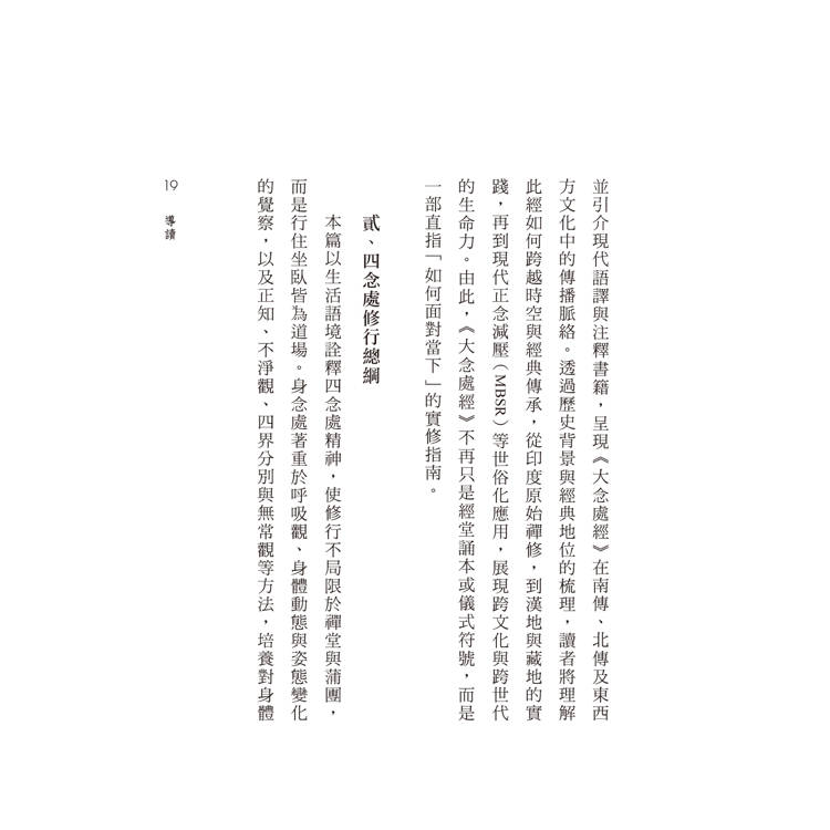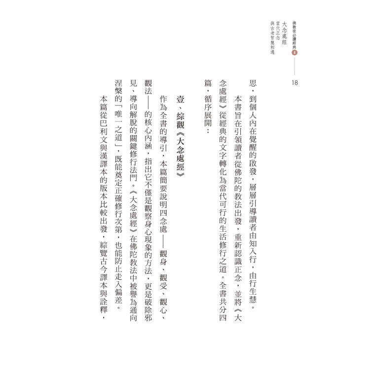 佛陀所說的《大念處經》是一部跨越時空、映照現代人心的覺醒之書。此部經文是原始佛教中最具影響力的修行經典之一,完整呈現「四念處」的修習結構與解脫之道。佛陀於經中明言:「此為唯一之道」,此道不僅是一條導向涅槃的修行之路,更是一條認識自心、解開痛苦、重建清明生活的實踐路徑。《大念處經》提供的不只是理論的認知,而是一種身體力行、呼吸之間即可起步的修行之道。這正是佛法之所以歷久彌新、跨越文化與語言界線,至今仍能感動人心的根本原因。本書旨在引領讀者從佛陀的教法出發,重新認識正念;在本書中,佛陀的語句不再高遠難攀,而是一面面映照身、受、心、法的明鏡,引導我們深觀自身與世界的真實面貌,從古老經典中汲取靜定與智慧,走上一條屬於自己的覺醒之路。