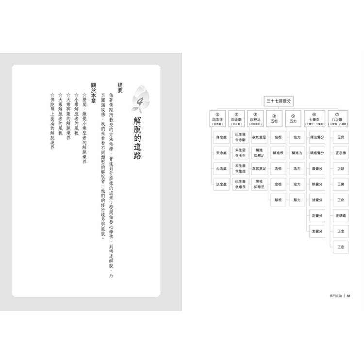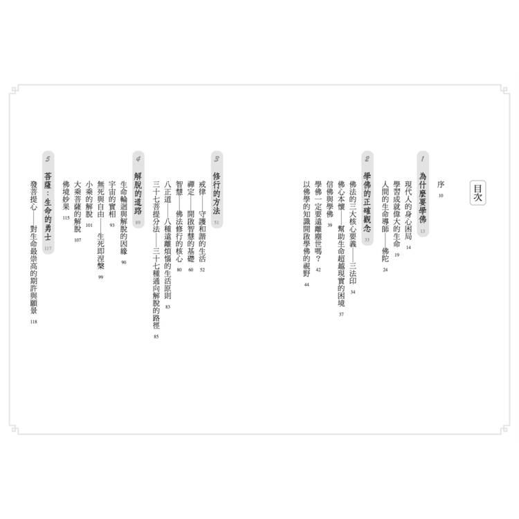 本書從「為什麼要學佛」談起,讓你認識佛法對生命的意義。確立了正確的學佛心態,進而談佛法中修行的主體方法:戒、定、慧三學,及三十七解脫品、八正道。經由如法的修持,則能達到解脫的境界。但依於發心及行持不同,而產生了聲聞、緣覺聖者,及菩薩、佛,小乘、大乘不同的果位。