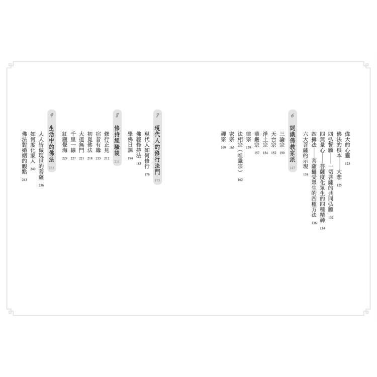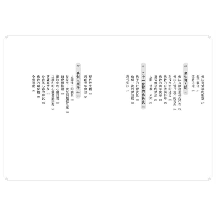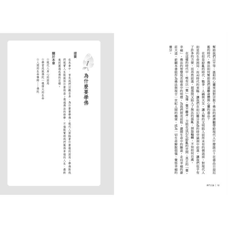 本書依於這樣的理路,將個人對佛法的體認,簡要分為十二個大項,希望能為現代人搭起佛法的橋梁,幫助大家從浩瀚廣大的智慧寶藏中,迅速掌握佛法的要義,並有適合現代生活環境、具體的修持方法得以修學。