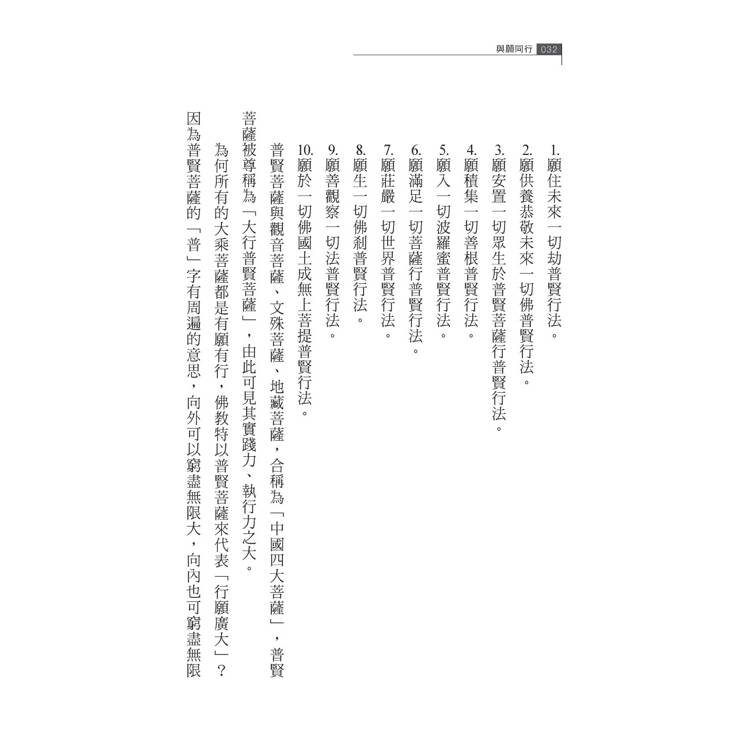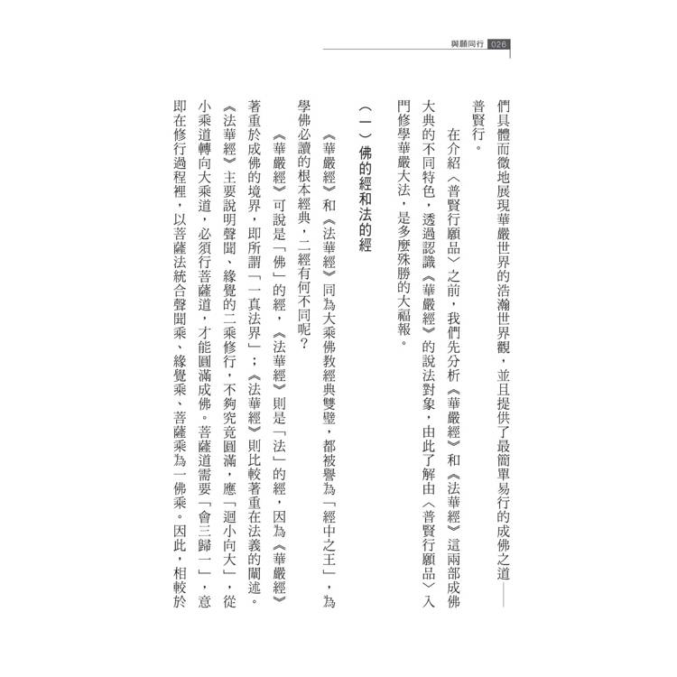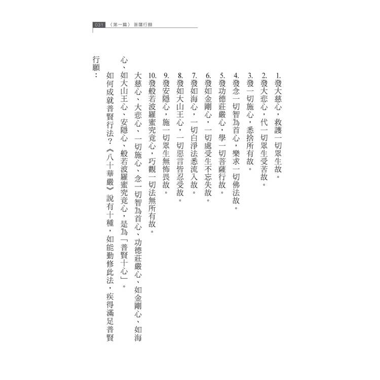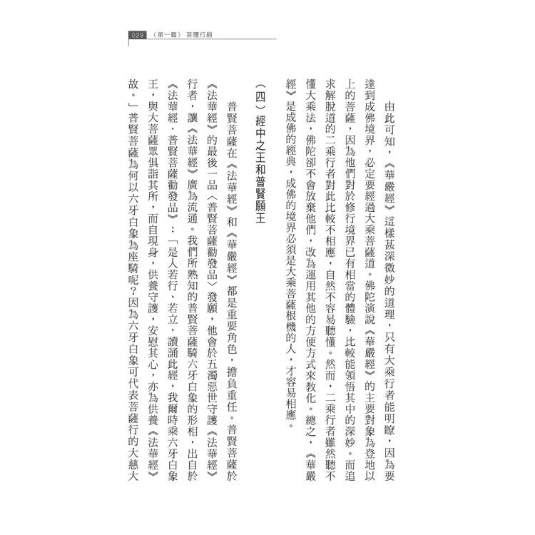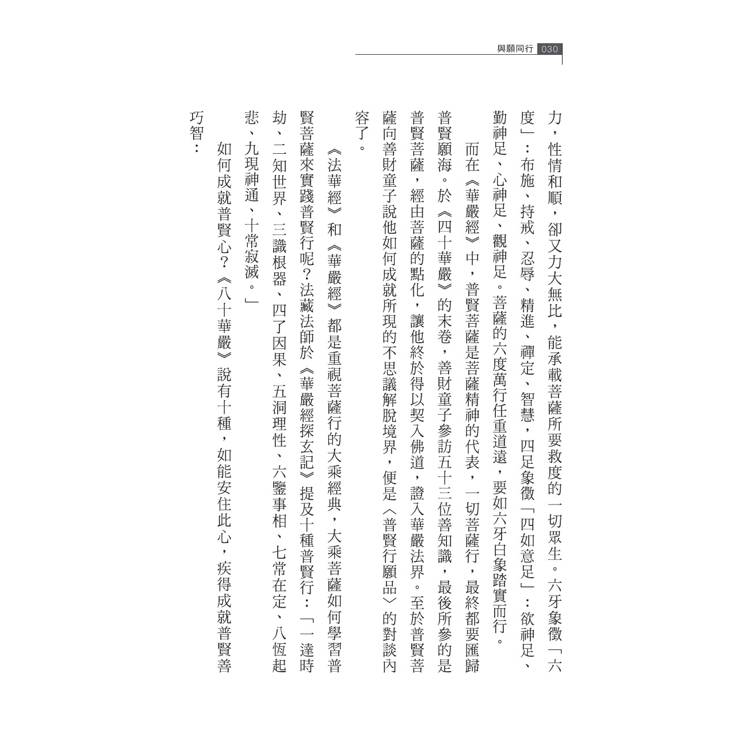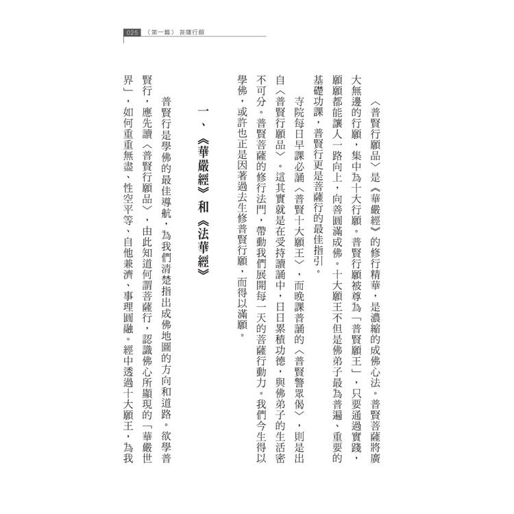 〈普賢行願品〉的內容,主由十大願王和重頌所組成。因授課講說〈普賢行願品〉,採用演培法師的《華嚴經普賢行願品講記》為教材,所以本書主體架構也由此而成,希望透過層次分明的引導,能讓讀者深入行願之道,於重重無盡的法界,與普賢菩薩同願同行。