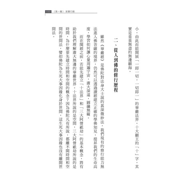 我們為什麼是凡夫境界?就因為著相,但見有我相、人相、眾生相、壽者相的種種差別相、顛倒相,而無法得見聖者乃至諸佛所見的平等相,得知成佛的境界。成佛之道需要經歷三大阿僧祇劫的時間,我們只要發了菩提心便是凡夫菩薩。凡夫菩薩在第一大阿僧祇劫圓滿而超凡入聖,是「聖賢菩薩」;聖賢菩薩在第二大阿僧祇劫七地圓滿,是「菩薩摩訶薩」;菩薩摩訶薩在第三大阿僧祇劫圓滿,則能圓滿成佛。貫穿於其間的,即是〈普賢行願品〉的普賢行,也就是十大願王。