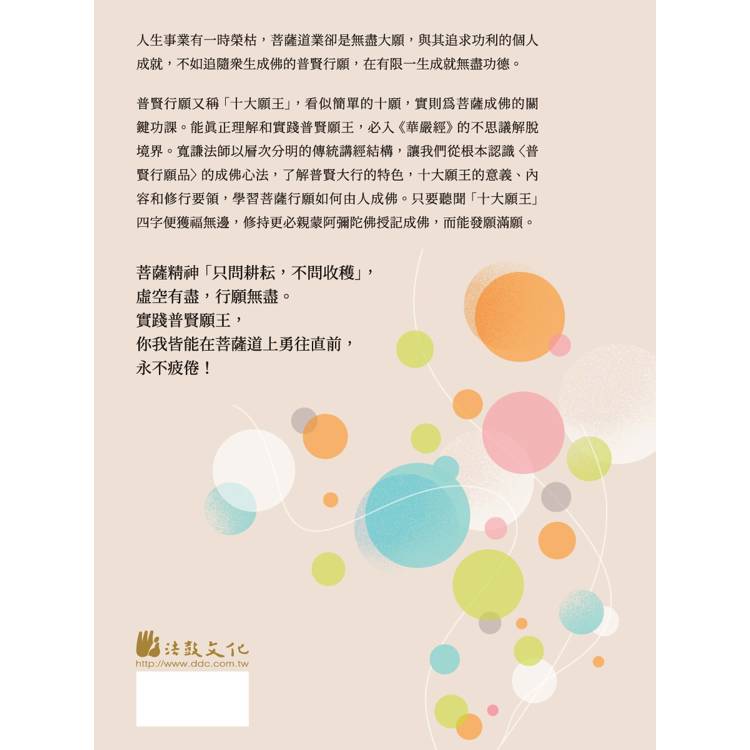 寬謙法師在本書以層次分明的傳統講經結構,帶我們從根本認識〈普賢行願品〉的成佛心法,了解普賢大行的特色,十大願王的意義、內容和修行要領,學習菩薩行願如何由人成佛。